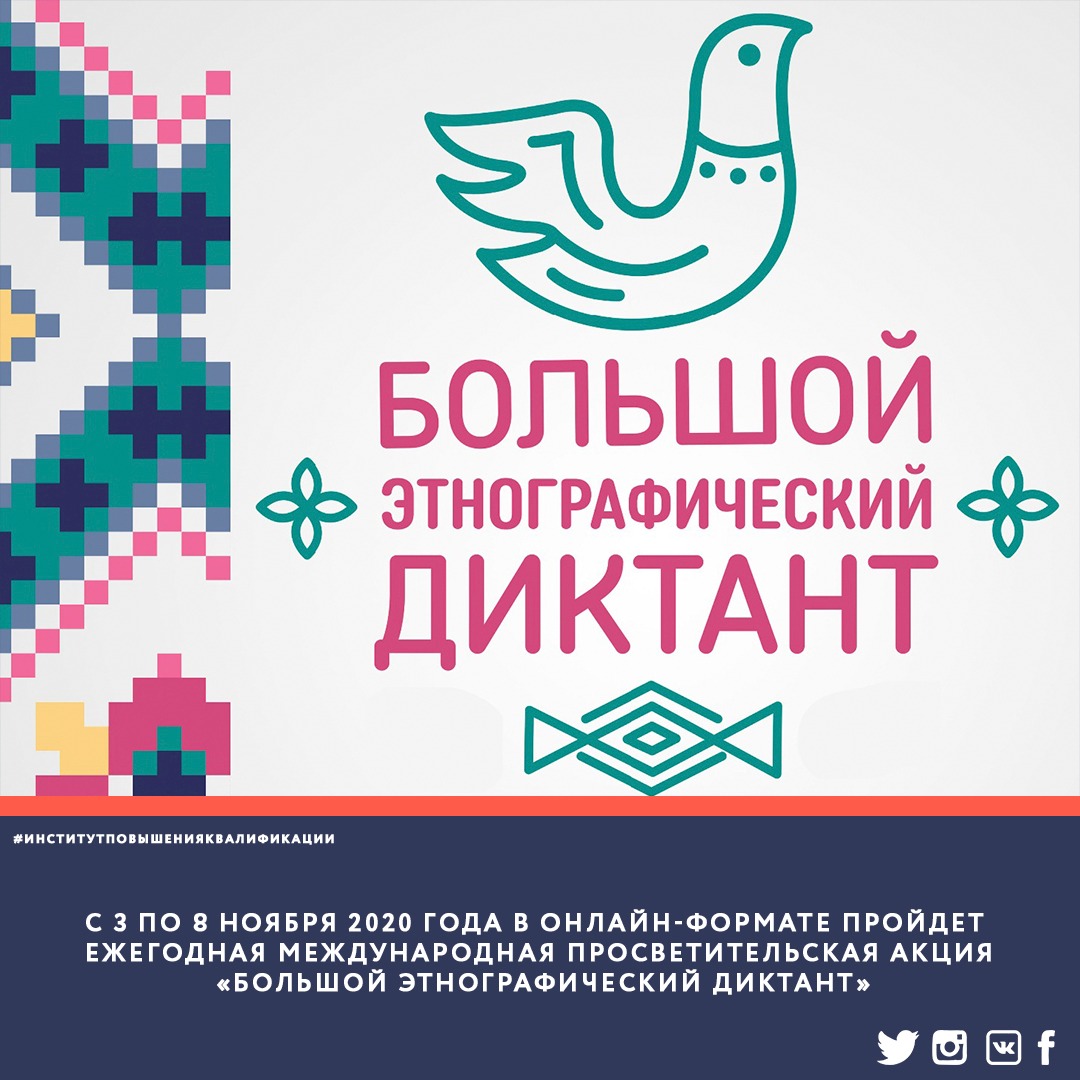 С 3 по 8 ноября 2020 года в онлайн-формате пройдет ежегодная Международная просветительская акция «Большой этнографический диктант». Диктант позволяет оценить уровень этнографической грамотности населения, их знания о народах, проживающих в России. Участниками могут стать все желающие жители России и зарубежных стран.
