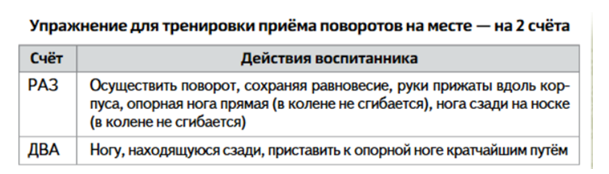 • первый приём — повернуться, сохраняя правильное положение корпуса, и, не сгибая ног в коленях, перенести тяжесть тела на впереди стоящую ногу;