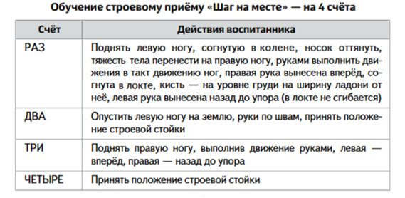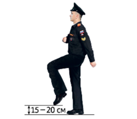 По этой команде надо обозначать шаг подниманием и опусканием ног. При этом ногу следует поднимать на 15–20 см от земли и ставить её на всю ступню, начиная с носка, а руками необходимо производить движения в такт шага.