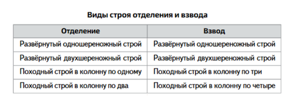 Для построения отделения в развёрнутый одношереножный строй командир подаёт команду, например: «Первое отделение, в одну шеренгу — СТАНОВИСЬ».