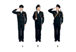 Выполнение воинского приветствия. Для выполнения воинского приветствия на месте вне строя без головного убора учащийся необходимо за три-четыре шага до начальника/ старшего повернуться в его сторону, принять строевую стойку и смотреть ему в лицо, поворачивая вслед за ним голову.