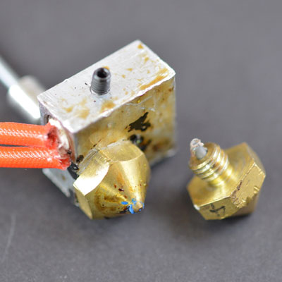1.4) Засор экструдера. Также часто встречается. Основная причина засора – пыль, нагар и стеклование. Исправляется прочисткой сопла (см. соответствующую тему)
