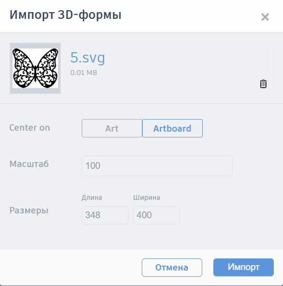После того как мы получили нашу бабочку в нужном формате, откроем Тинкеркад и нажмём кнопку «Импорт» вверху экрана. В открывшемся окне выберем нужный нам файл SVG и его параметры, а затем нажмём «Импорт»