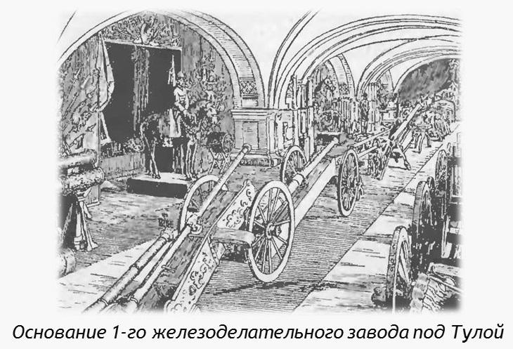 Действительно, для Тулы оружейное дело — тема ее истории не просто магистральная, но причастная к самой, что ни на есть, сущности ее «души». Оно же во многом определяет место города в истории Отечества. Тула — арсенал России, она — ее кузница. Одной из предпосылок такой специализации города явилось то обстоятельство, что в тульском крае издавна широкое распространение получило металлопроизводство. В нескольких местах неподалеку от города (в частности, в Малиновой засеке) добывалась руда, которую перерабатывали крестьяне домники в своих сыродутных горнах. В XVI в. на территории Тульского и прилегавших к нему уездов еще довольно многочисленными были леса, обеспечивавшие металлургов древесиной для выжигания древесного угля. И не случайно, что именно под Тулой, на реке Тулице у села Торхова, в 30-х гг. XVII в. иностранные купцы — нидерландец Андрей Денисович Виниус и его компаньоны — построили первые в России «мельничные» железные заводы. Так их называли потому, что они были вододействующими — важнейшие их машины и механизмы приводило в действие колесо, которое крутила речная вода. На этих Тульских заводах (или Городищенских, как их иногда называли по Старогородищенскому стану, в котором они находились), в первой российской домне был получен первый в государстве промышленный чугун и освоена технология переработки его в железо. Первое заводское железо поступило в казну 24 марта 1636 г. Эта дата начинает историю доменной металлургии России. В начале 1650-х гг. вытеснившие Виниуса из дела предприниматели (тоже иностранцы) П. Марселис и Ф. Акема на реке Скниге (сейчас Тульская обл.) построили заводы, называемые Каширскими — первое в России специализированное передельное предприятие (на нем привозной чугун перерабатывали в железо).