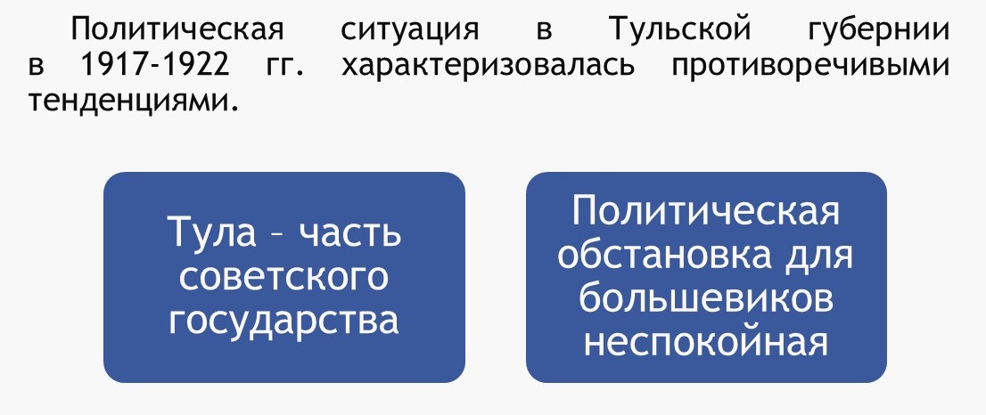 Политическая ситуация в Тульской губернии в 1917-1922 гг. характеризовалась противоречивыми тенденциями. С одной стороны, с декабря 1917 г. Тула стала частью советского государства, с другой — политическую обстановку в городе и регионе для большевиков нельзя было назвать спокойной. Это было в целом свойственно политическому спектру Тулы: «казенный» статус города обусловил симпатии местных рабочих не к радикалам-большевикам, а к меньшевикам и эсерам. При этом политическая активность в деревне была минимальной, а в Туле — максимальной. К октябрю 1917 г. в городе среди населения превалировали меньшевики