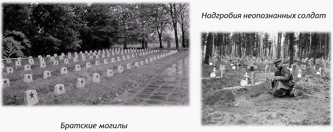 Начиная с зимы 1941 г. перед местными партийными и советскими органами, военкоматами стояла задача по захоронению погибших бойцов, содержанию братских могил. На кладбищах Тулы было захоронено ок. 6000 солдат и офицеров Красной армии. Братские и одиночные могилы были в каждой деревне, в каждом рабочем поселке и городе, где проходили бои. Всего в них было похоронено более 360 тысяч человек.