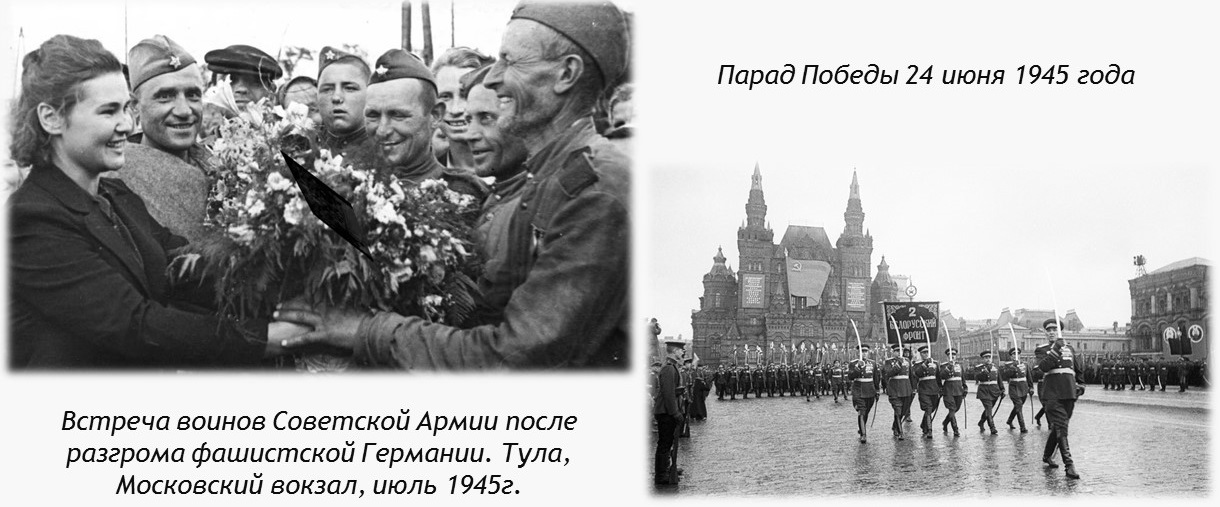 Символом окончания войны стал парад Победы, который прошел 24 июня 1945 г. на Красной площади в Москве. В нем приняли участие свыше 300 чел., представлявших Тульскую область. Среди них — 210 учащихся, два сержанта и 14 офицеров из Тульского суворовского училища, входивших в сводный Суворовский полк.