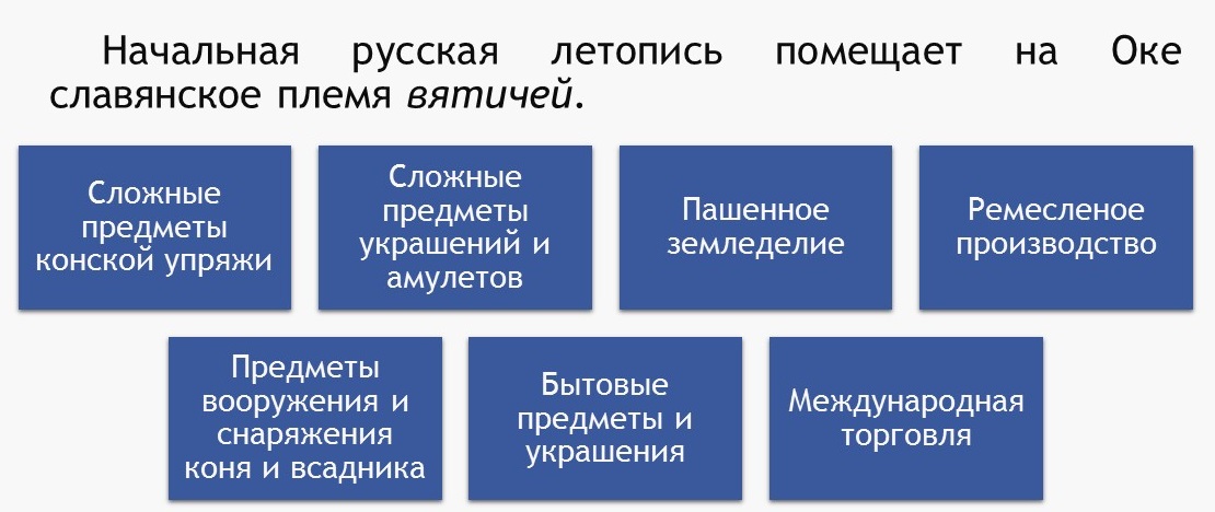 Это зримо демонстрируют находки из Супрутского городища. Сложные предметы конской упряжи, наличие стремян, сложные предметы украшений и амулетов, извлеченные из погребальных урн, показывают высокий уровень искусства вятических металлургов. Основу их хозяйства составляло достаточно высоко развитое для своего времени пашенное земледелие с применением пахотных орудий, снабжавшихся железными наконечниками, высокого развития достигло у них ремесленое производство, интенсивно шел процесс отделения ремесла от сельского хозяйства. На городищах найдено значительное количество предметов вооружения (наконечники стрел и копий, боевые топоры, булава и т.п.) и снаряжения коня и всадника (фрагменты удил, псалии, пряжки от сбруи и др.), орудий ремесла (долота, зубила, напильник, крупные пружинные ножницы, специализированные ножи и т.п.), сельского хозяйства и промыслов (сошник, серпы, косы, пешня и др.), различных бытовых предметов и украшений, в том числе привозных из Приднепровья, Средней Азии и других весьма удаленных регионов ( кованные ножницы из западной Европы, гирьки и монеты с арабского востока, костяной гребень из Сканднавии). Расселившись на Верхней и Средней Оке, вятичи втянулись в международную торговлю, в том числе со странами Востока, одной из важных артерий которой был Окский путь. Одним из самых распространенных предметом торговли были замки, имевшие не поворотные, а пружинные механизмы. Изготовленные в нашем регионе, они встречаются в находках далеко за пределами земель вятичей.