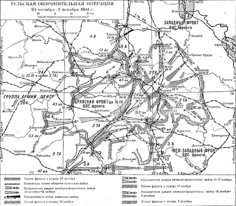 2 декабря 1941 г. немецко-фашистские войска снова прорвали оборону 50-й армии и на следующий день заняли станцию Ревякино, тем самым перерезав железную дорогу, соединяющую Тулу с Москвой. 29 ноября немцы взяли Алексин и продолжили наступление на Суходольском направлении. Вражеское кольцо вокруг Тулы сжималось. Оставался свободным лишь коридор по Московскому шоссе шириной 5-6 км, но и он простреливался немцами в нескольких местах. К исходу дня 3 декабря передовые части противника заняли Кострово, Хомяково, Севрюково, перерезав тем самым Московское шоссе в 15-25 км севернее Тулы. По приказу командования Западного фронта войска 50-й армии, которой с 22 ноября командовал генерал-лейтенант И. В. Болдин, 49-й армии под командованием генерал-лейтенанта И.Г. Захаркина и часть сил 1-го гвардейского кавалерийского корпуса 4-5 декабря 1941 г. нанесли сильный контрудар по танковой группировке противника. Потерпев неудачу в попытках захватить Тулу с запада, юга, востока и севера немецкое командование предприняло новую фронтальную атаку на Тульском боевом участке. 7 декабря в 22.00 немцы из района Маслово начали атаку на западную окраину Тулы. На следующий день советские войска отбросили противника, положение на этом участке фронта было восстановлено. Таким образом, в период героической обороны г. Тулы (24 октября — 6-7 декабря 1941 г.) наступление немецко-фашистских войск в обход Москвы было сорвано. Однако опасность для Тулы со стороны противника не миновала. Главные силы 2-й немецкой танковой армии Гудериана ещё находились на ближних подступах к городу с юга и к востоку, и после перегруппировки своих сил могли возобновить наступление на город.